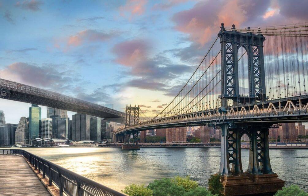 Манхэттенский мост — представляет собой элегантное сооружение из металла длиной в 2 километра над Ист-ривер высотой в 40 метров. Его строительство было прорывом для своего времени. Он олицетворяет индустриальный стиль прошлой эпохи, силу передовой инженерии и инноваций. Смотря на него ощущаешь всю мощь и силу металла. Рекомендуем посетить его и полюбоваться чудом мировой инженерии. Ещё один мост, который связывает Манхеттен и Бруклин. По нему идет много поездов метро, есть велодорожки. Пешком людей ходит гораздо меньше. Мост пересекает Ист-Ривер в Нью-Йорке и соединяет Нижний Манхэттен на Канал-стрит с центром Бруклина.